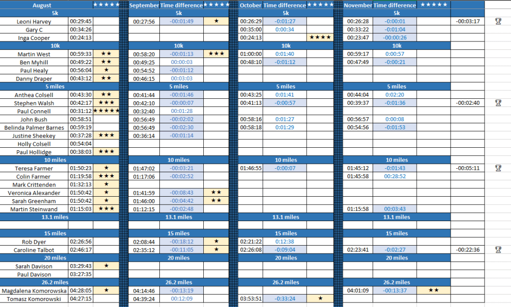 We will put you into divisions so that there is an opportunity for more people to be fighting out for a podium position which we’ll look at when the entry time finishes. So if you haven’t done so already let Paul know if you’re interested in taking part, entry closes on the 4th December and racing starts on the 14th December with the last day to run being the 28th February. We’re hoping that this is a little different to just doing a virtual run and has a number of distances for you all to do. We’re looking at all the routes and will get details of the courses to you ahead of the start of racing.